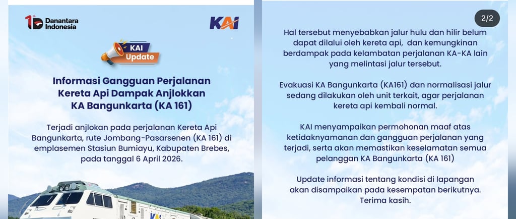 KAI memastikan akan terus memberikan update terbaru terkait kondisi di lapangan hingga jalur dapat kembali beroperasi secara normal.