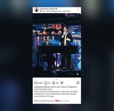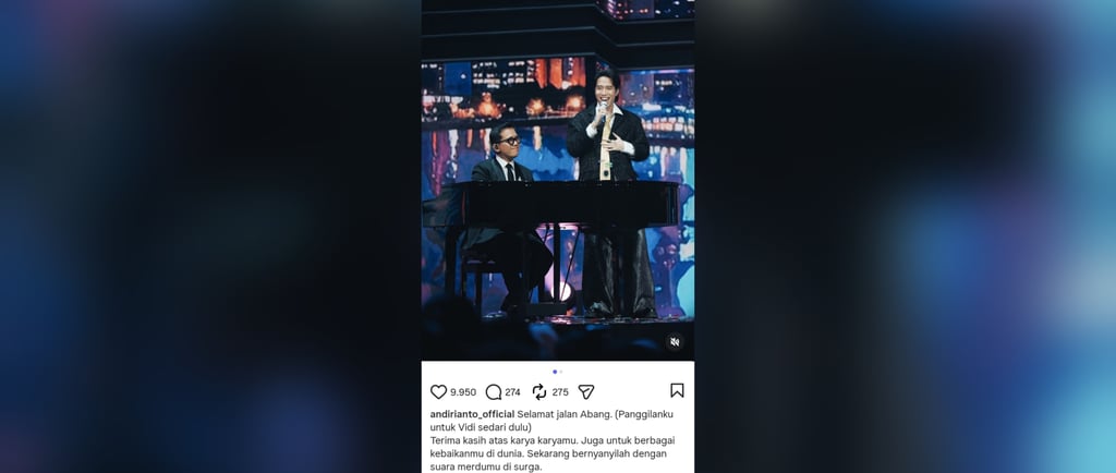 “Selamat jalan, Abang. (Panggilanku untuk Vidi sedari dulu)...,” tulisnya dalam unggahan singkat.