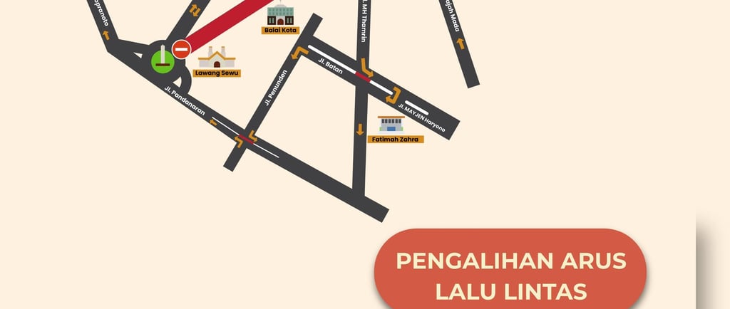 Pengalihan arus lalu lintas akan diberlakukan mulai pukul 12.00 WIB hingga seluruh rangkaian kegiatan selesai. Pada tahap awal, pembatasan arus kendaraan dilakukan di sekitar Simpang Gendingan. Saat rombongan kirab memasuki pusat kota, pengalihan diperluas hingga kawasan Jalan Gajahmada dan Kauman.